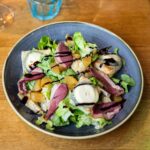 Salade, chèvre Sainte-Maure, toasts de bruschetta, miel, magret de canard fumé, artichauts grillés, crème balsamique